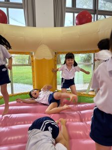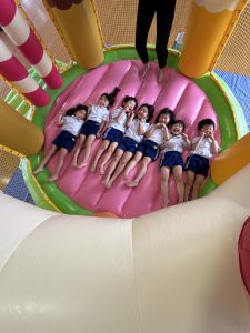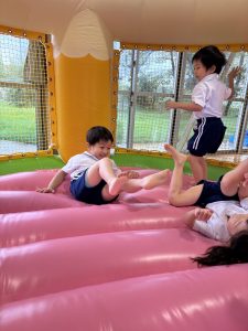 膨らませたケーキ型の遊具の中に入って飛び跳ねて遊びます。