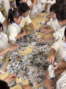 新聞遊びのようですが、工作の はりこ の用意です。準備とは言え、ちぎった新聞をふわふわさせて楽しんでいました。