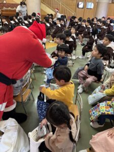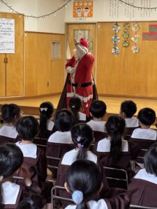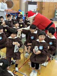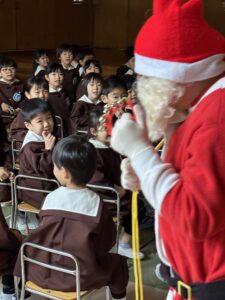 クリスマスの由来やツリーのオーナメントの意味などのお話を聞いた後は、お待ちかねのサンタクロースがやってきてくれました。