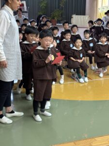 ばら組(年長)さんが、どこからきたのかな、何歳なのかな、好きな食べ物は? と事前にクラスで考えた質問をしました。みんなの前でしっかり言うことができましたね。