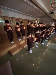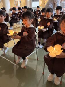 火の女神さまからろうそくの火を分けてもらい、3・4・5歳児さん一人ひとつ持ったろうそくに火を付けていきます。