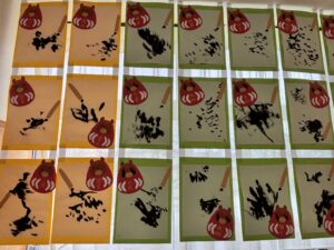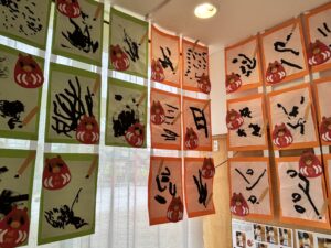 0・1・2歳児のつぼみ、たんぽぽ組さんも習字筆と半紙に墨汁で書いてみました。