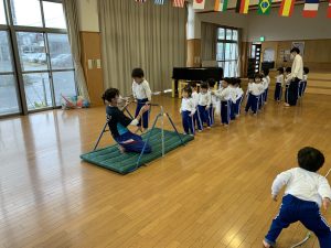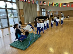鉄棒で「足かけ回り」「自転車こぎ」・マットで「カエルジャンプ」に挑戦です👍