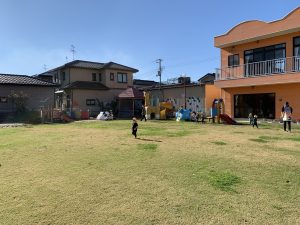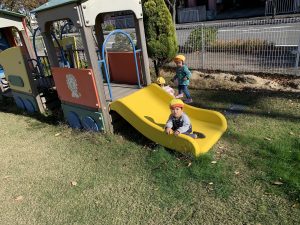 1歳児すみれ組のお友達は、広い園庭に出て、シャボン玉や遊具で遊びました。