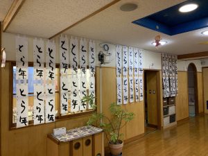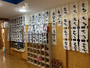 2022.01.28 日々の様子 書初めを掲示しました🖌 1月のあたまに行った、書初めを玄関に掲示しました! 3歳児さくら組は、「もち」 4歳児ゆり組は、「とら年」 5歳児ひまわり組は、「希望の光」 ひまわり組は、クラス・名前も自分で書きました👍 一人一人とても上手に書けました✨