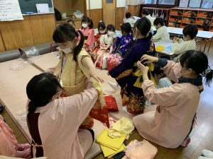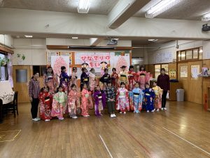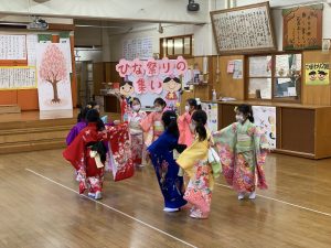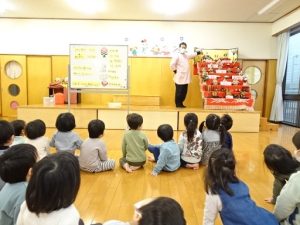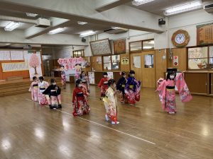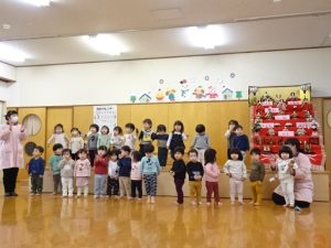 2022.02.28 日々の様子 ひな祭りの集い🎎 今日は、「ひな祭りの集い」を行いました🎎 未満児のお友達も各クラスごとにホールに集まり、ひな祭りの由来やひな人形の紹介のお話を聞きました。 以上児クラスの女の子は、髪飾りをして行いました。 年長組のひまわり組さんは、着物を着て参加しました。 今回も各クラスごとにホールへ来て、歌の発表を行いました。 ひまわり組さんは、「和」のお遊戯もしました👏 着物姿がかわいらしいですね🥰 最後は、ひまわり組さん皆でパシャリ📸