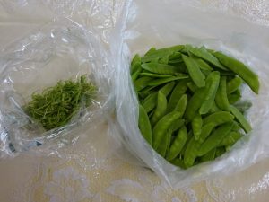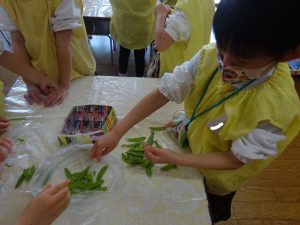 煮物に入れるさやえんどうは、ひまわり組のお友達がすじ取りをしてくれました❗
