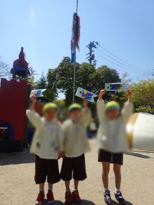 ステンドグラス風にした鯉のぼりの制作をお日様に向けて色の出方などを楽しんでいます🎏