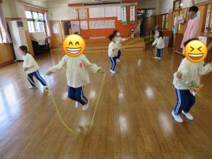 年長ひまわり組さんは、ホールでなわとびの練習。