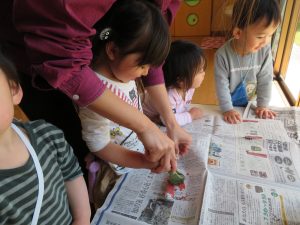 2歳児たんぽぽ組さんは、お店屋さんごっこの準備で新聞紙に色を塗っています🖍