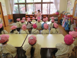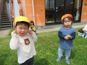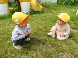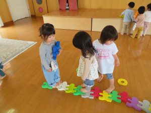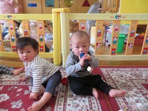 2歳児たんぽぽ組さん、0歳児つぼみ組さんは、お部屋で遊んでいます。