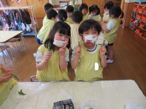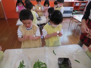 なんと、スナップえんどうのすじ取りは年長のひまわり組さんがしてくれました👍