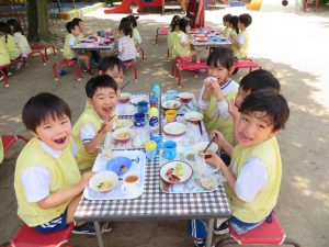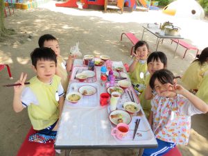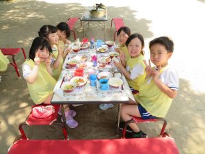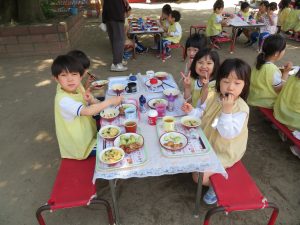 また、ひまわり組さんは、園庭で給食をいただきました。