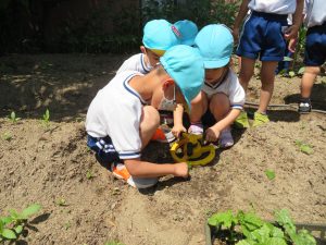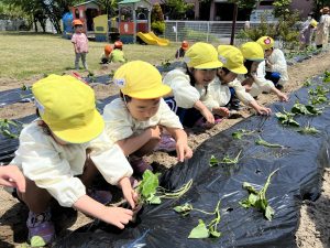 2022.06.01 日々の様子 6月1日(水)🌞 今日から6月(水無月)です6️⃣ 今月もよろしくお願いいたします。 今日は、年長のひまわり組さんが未満児園舎の畑にさつま芋の苗を植えました。 年中のゆり組さんは、クラス野菜のナスを観察しに畑へ。 スプリンクラーに興味津々の子ども達でした😂 年少のさくら組さんは、園庭で遊んだ後、みんなで水分補給タイムです。 みんなで並んだ可愛い写真が取れました📸 以上児園舎の畑にもさつま芋の苗を植えました。 以上児園舎は、職員が植えました👍