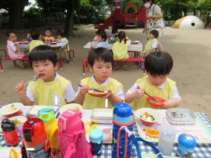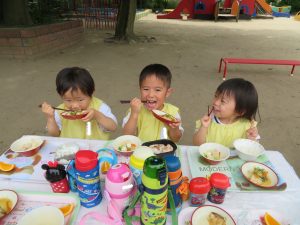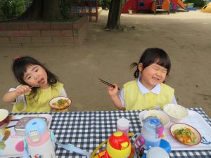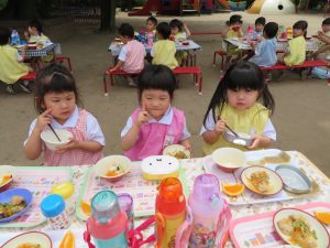 みんなで食べるお外での給食は、一段と美味しかったですね。