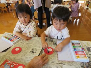 2歳児たんぽぽ組さんは、制作帳とクレヨンを使い、何かを作っています🤔