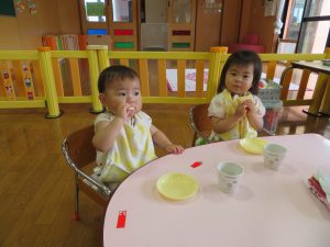 1歳児すみれ組さんのおやつを食べる様子もかわいいですね😘