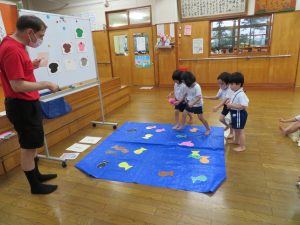 さくら組さんは、英語の先生が示した色のお魚を見つけるゲームをしました🐟🐠