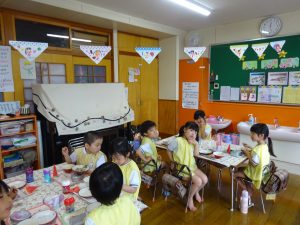 ひまわり組さん、5日(金)のBBQに向けて園庭に飾るガーランドを制作しました❗