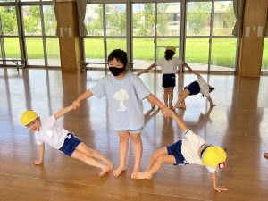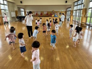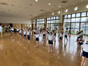 たんぽぽ組さん、広いホールを使って元気よくお遊戯をしています😁