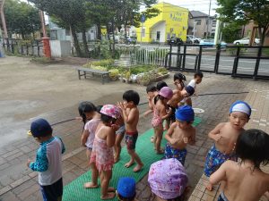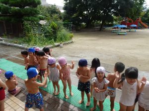 園庭で水浴びをしました。少し寒そうにしていましたが、元気に遊んでいました😄