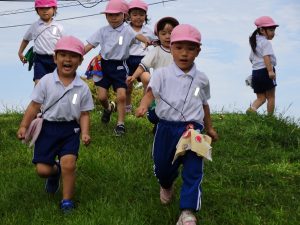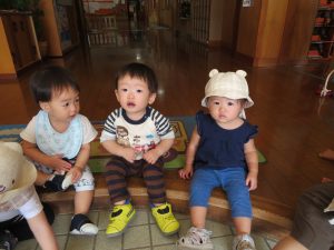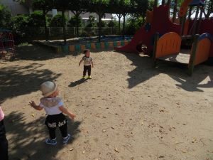 3歳児さくら組さんは、ひまわりホールの園庭で遊びました。