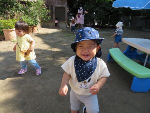 0歳児つぼみ組さんは、以上児園舎の園庭へ遊びに来ました。
