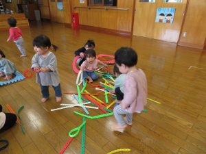 以上児のお友達がいないホールで、お兄さんお姉さんの玩具を借りて楽しそうに遊んでいました🎵