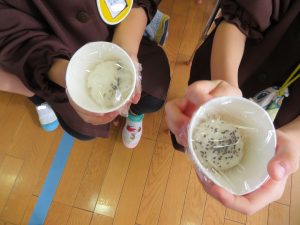 紙コップにご飯を入れて、ラップをしてシャカシャカします。