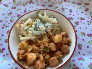 今日は、23日(水)に対戦するドイツの料理、「カリーブルスト風ソテー」でした。