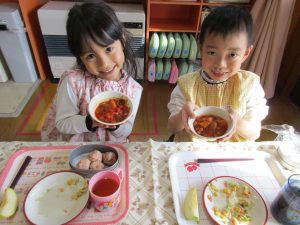 「トマト味でおいしいね」「ポークビーンズに似てるね」といろいろな発見がありました❗