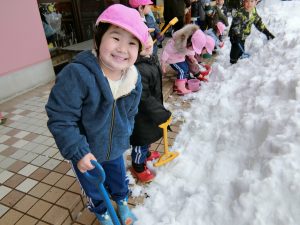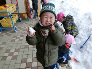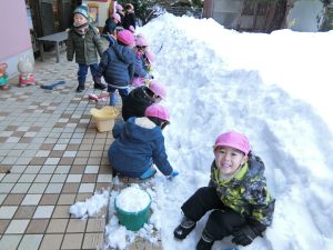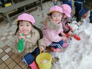 3歳児さくら組さんは、雪で遊びに園庭へ。