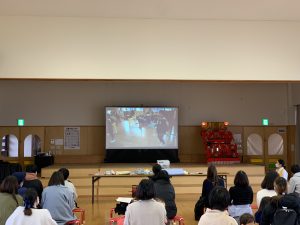 保育園での子ども達の様子を動画にして、スクリーンでご覧いただきました。