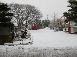 保育園の園庭も真っ白になり、子ども達は「どんどん白くなるね」「また雪のペンキ屋さんの登場だー!」と雪景色を喜んで見ていました⛄
