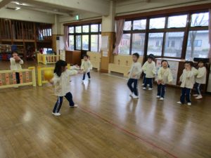 ゆり組さんは、ホールでドッジボールを楽しみました。