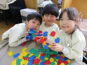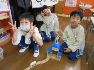 自由遊びの際には、ひまわり組さんが電車やブロックで遊んでいました。