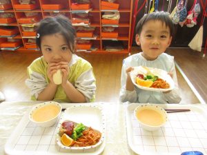 「ミートローフの中にコーンが入ってるよ!」などと、楽しくお話しながらいただきました。
