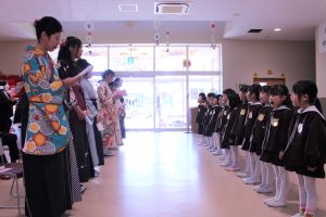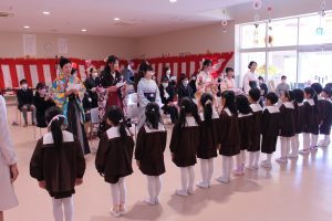 お姉さん先生の振り袖姿に子ども達は、「かわいい~!」と羨ましそうな様子でした。