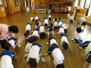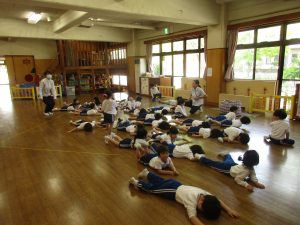 天気は良くても気温が高いため、長時間の外遊びはできず、さくら組さんはホールで組体操の練習をしました。
