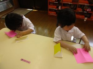 「お父さんは黄色、お母さんはピンク!」とみんなで色を決めて折りました。