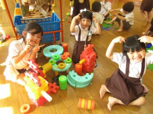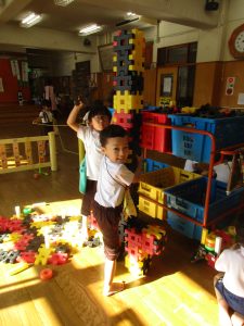 男の子たちは、ブロックで自分の身長よりも高いタワーをお友達と協力しながら作りました🗼