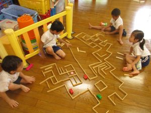 最近の朝の自由遊びでは、木のおもちゃ‟カプラ”がブームになっています。