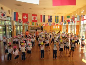 園長先生からのお話を聞き、皆で「頑張るぞー、エイエイオー!」をしてから競技を楽しみました。