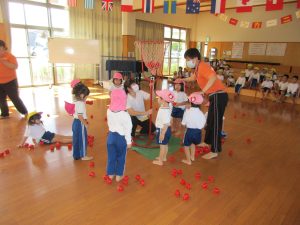 さくら組さんは玉入れ、ゆり組さんはボール運びレース、ひまわり組さんは二人三脚をしました。