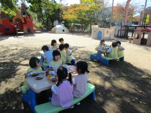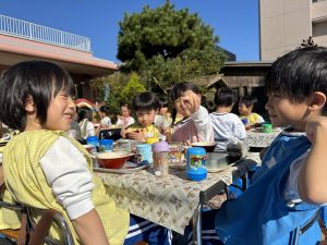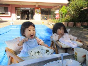 本当に良い天気で急遽お外での給食でしたが、とても楽しい雰囲気で給食をいただきました。