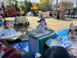 そんな貴重な1日を見逃さす、今日はつぼみ組さん、さくら組さん、ゆり組さんが給食をお外でいただきました🌞