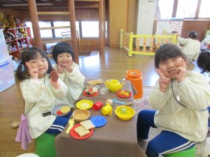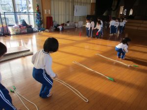 朝夕のホールでの自由遊びでは、おままごとや縄跳びをして過ごしています。