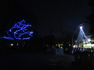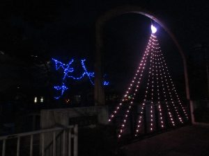 今年から保育園の沿道のフェンスや園庭の木にイルミネーションを装飾しました。