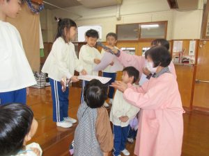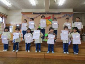 ジュニア展に出品したお友達に賞状が届き、園長先生から賞状を授与していただきました。