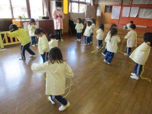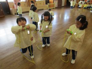 3歳児さくら組さんも自分で縄を前に回して、挑戦しています💪